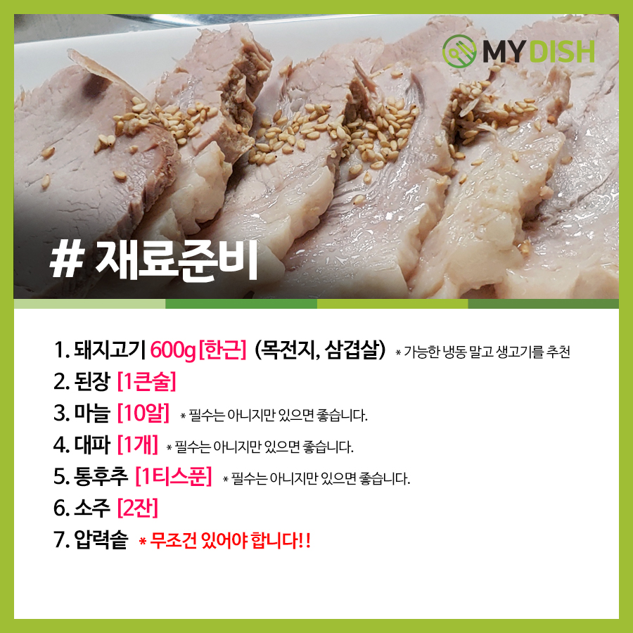 정말 최대한 양보해서 꼭 필요한 내용만 말씀드리면 [ 돼지고기, 된장(or마늘), 소주 ] 이거면 됩니다.