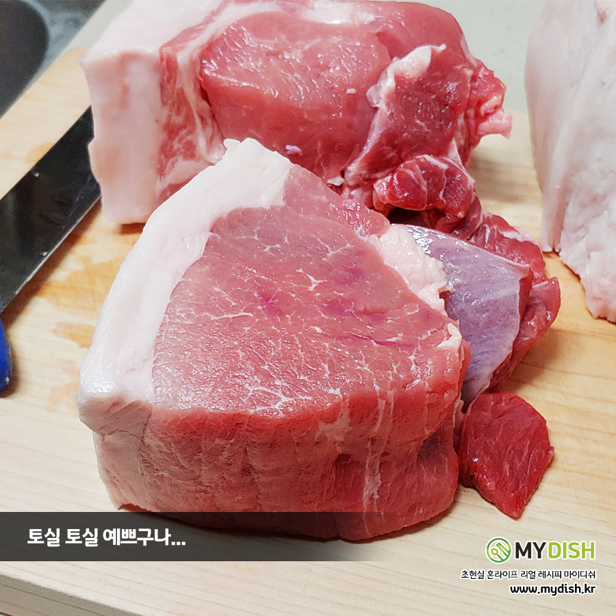 돼지고기는 이 레시피에서 목전지(앞다리살)를 사용했구요.. 삼겹살 부위를 사용해도 좋습니다.